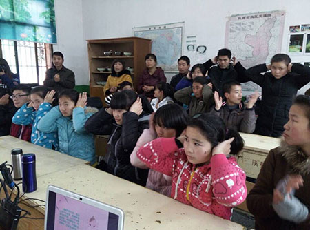 在楼观台聋哑学校,西安中大志愿者和孩子们开展了一场别开生面的讲课活动。授课主题为:如何根据穴位按摩预防感冒。在手语翻译员的帮助下,医护人员耐心细致的向学生们传授穴位按摩方法与技巧,孩子们一丝不苟的模仿学习,目光专注而热烈。课堂上只能听见志愿者们温情的讲课声,相比正常课堂增加了一份肃穆之气。通过孩子们欢快的手语动作,才能看出现场气氛的活跃与热烈。